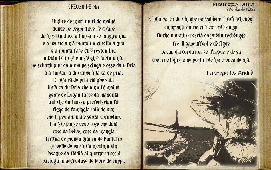 emigrantes de la risa, con clavos en los ojos / hasta que la mañana crezca y se pueda retomar / hermana de los claveles y de las muchachas / dueña de la cuerda podrida de agua y sal / que nos ata y nos lleva a una linde de mar"). La canción puede evocar olores y aromas de la cocina de Liguria ( "fritura de chanquetes , blanco de Portofino / sesos de cordero al mismo vino / lasañas para cortar a las cuatro salsas / "pasticcio" agridulce de liebre de tejas") o incluso provocar destellos de un "Oriente lejano y misterioso" ( "Sombras de rostros, rostros de marineros / de dónde venís, a dónde vais / de un lugar donde la luna se muestra desnuda / y la noche nos ha apuntado el cuchillo a la garganta / y a montar el borrico se ha quedado Dios / el diablo está en el cielo y allí ha construido su nido").